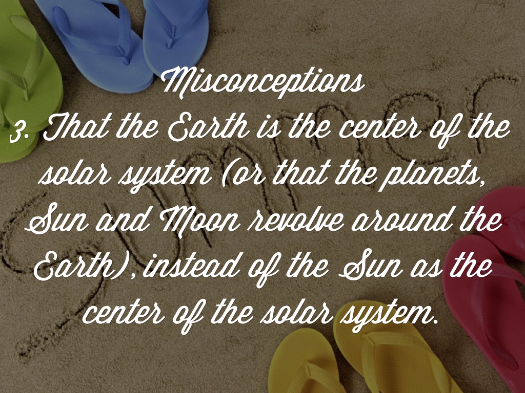 3. That the Earth is the center of the solar system (or that the planets, Sun and Moon revolve around the Earth), instead of the Sun as the center of the solar system.