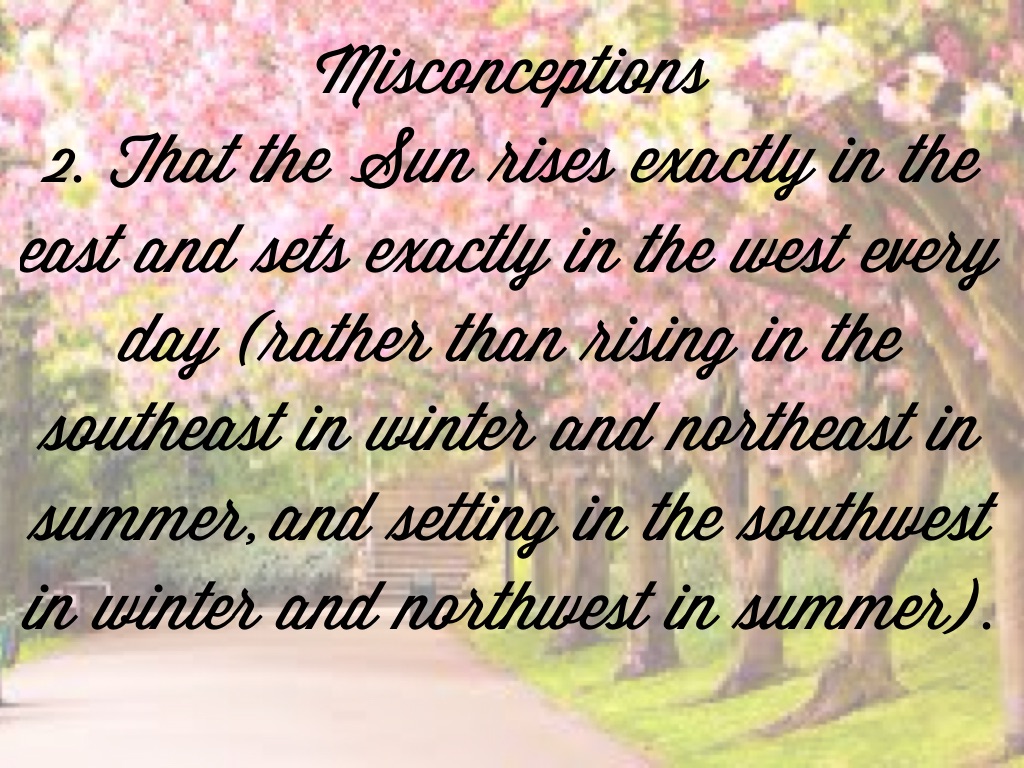 2. That the Sun rises exactly in the east and sets exactly in the west every day (rather than rising in the southeast in winter and northeast in summer, and setting in the southwest in winter and northwest in summer).