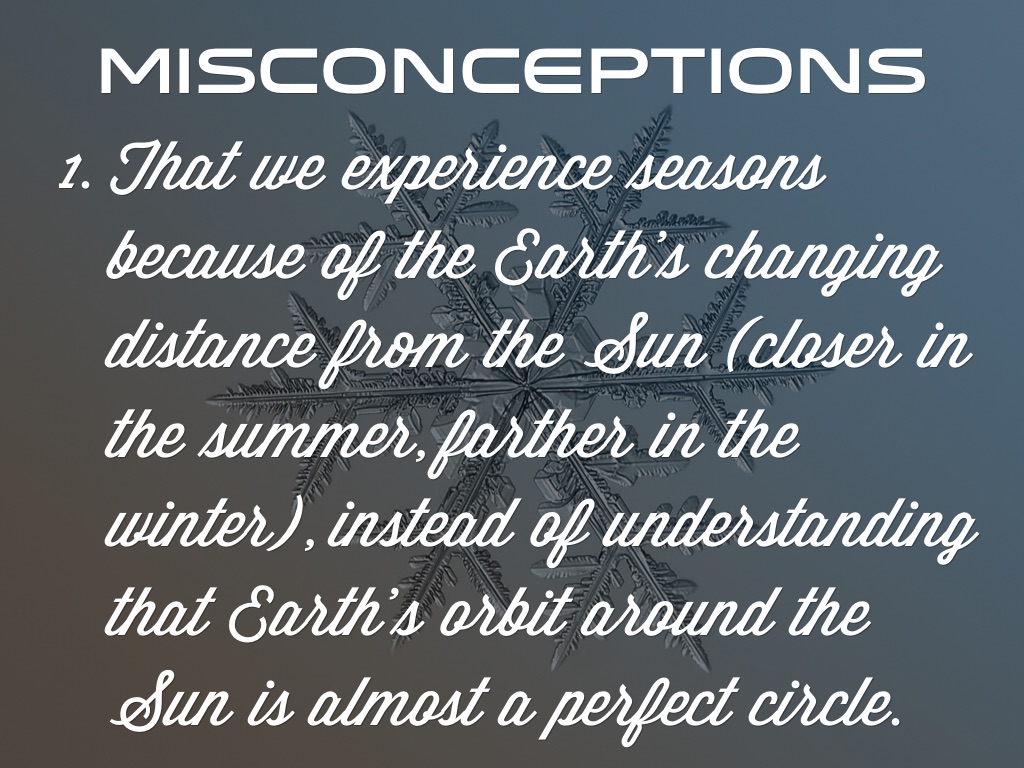 • That we experience seasons because of the Earth's changing distance from the Sun (closer in the summer, farther in the winter), instead of understanding that Earth’s orbit around the Sun is almost a perfect circle.