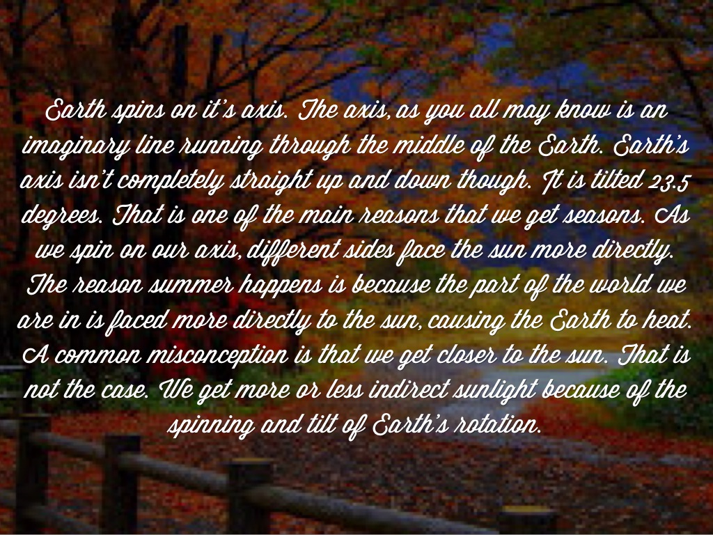 Earth spins on it's axis. The axis, as you all may know is an imaginary line running through the middle of the Earth. Earth's axis isn't completely straight up and down though. It is tilted 23.5 degrees. That is one of the main reasons that we get seasons. As we spin on our axis, different sides face the sun more directly. The reason summer happens is because the part of the world we are in is faced more directly to the sun, causing the Earth to heat. A common misconception is that we get closer to the sun. That is not the case. We get more or less indirect sunlight because of the spinning and tilt of Earth's rotation.