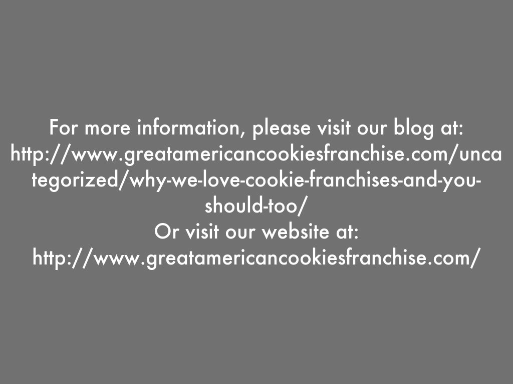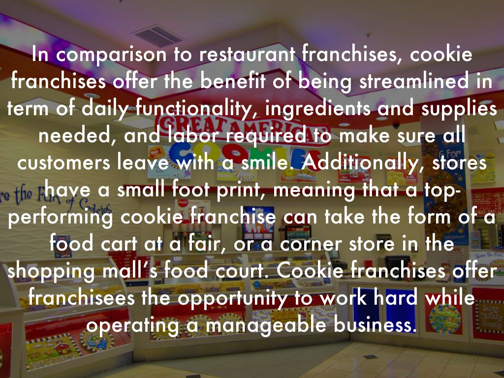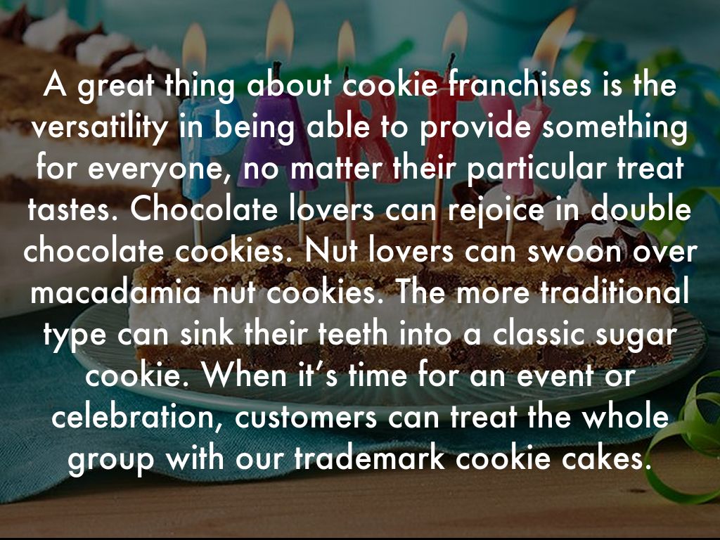 A great thing about cookie franchises is the versatility in being able to provide something for everyone, no matter their particular treat tastes. Chocolate lovers can rejoice in double chocolate cookies. Nut lovers can swoon over macadamia nut cookies. The more traditional type can sink their teeth into a classic sugar cookie. When it’s time for an event or celebration, customers can treat the whole group with our trademark cookie cakes.