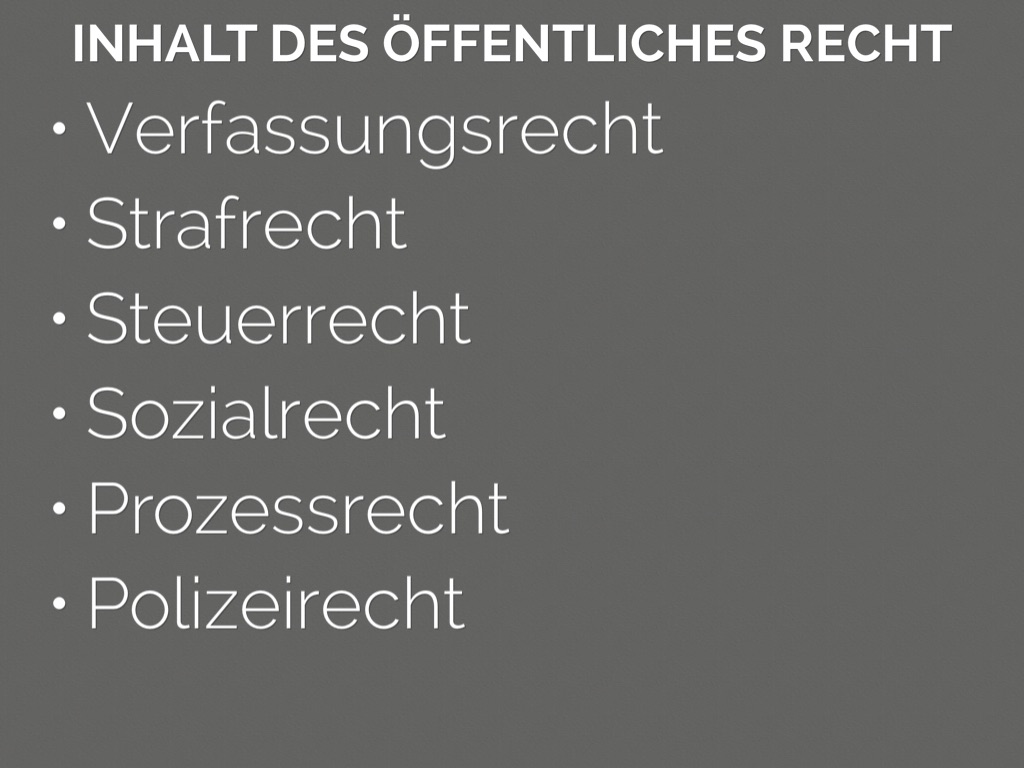• Das öffentliche Recht regelt rechtliche Beziehungen zwischen Privatperson und Trägern hoheitlicher Gewalt (z.b. Bund, Länder, Gemeinden) . Dieses Rechtsgebiet ist durch das Prinzip der Über- und Unterordnung gekennzeichnet. Träger hoheitlicher Gewalt können mithilfe von Befehl und Zwang gegenüber Privatperson handeln, wenn ein Gesetz dies zulässt.