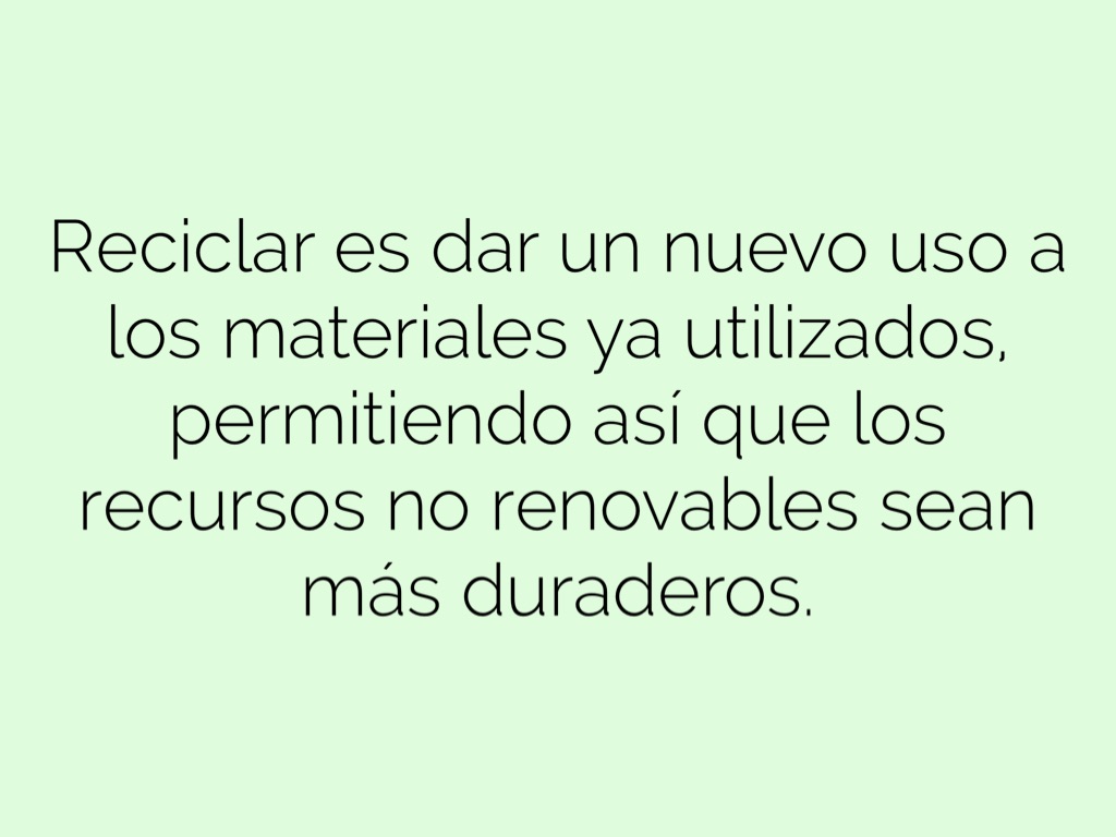 Reciclar es dar un nuevo uso a los materiales ya utilizados, permitiendo así que los recursos no renovables sean más duraderos.