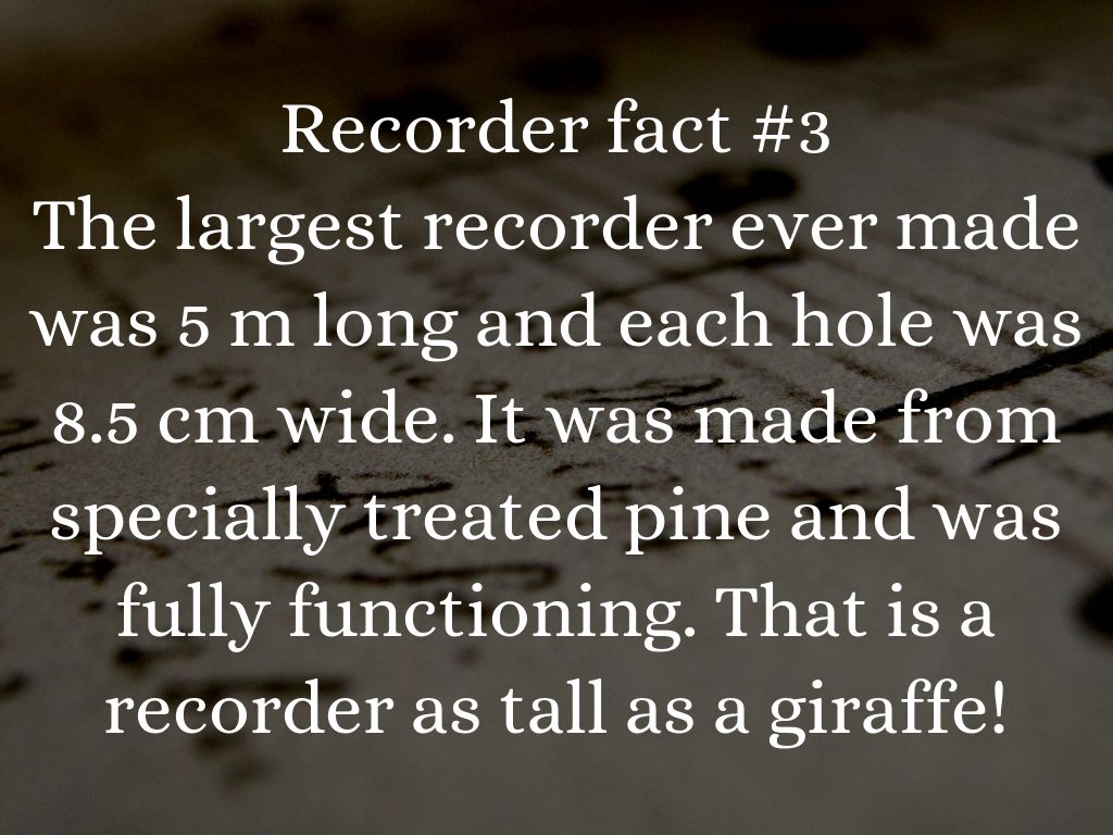 Recorder fact #3 The largest recorder ever made was 5 m long and each hole was 8.5 cm wide. It was made from specially treated pine and was fully functioning. That is a recorder as tall as a giraffe!