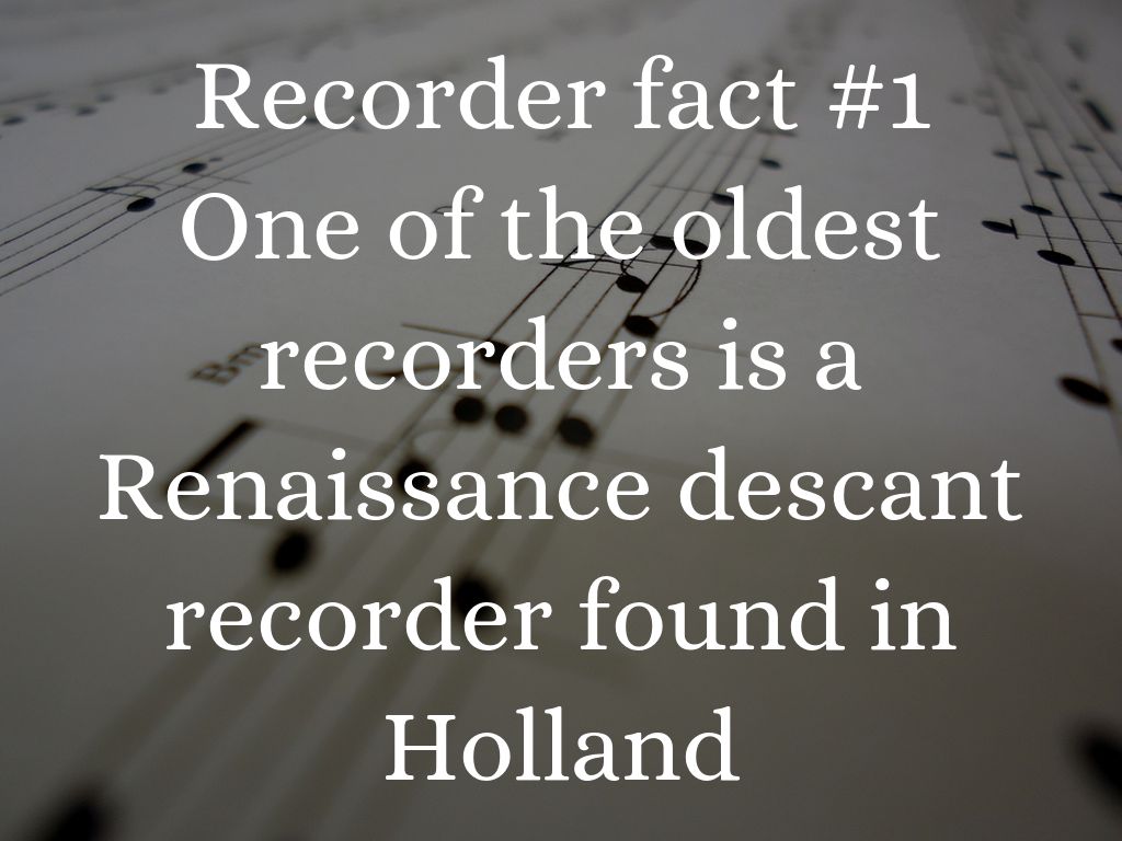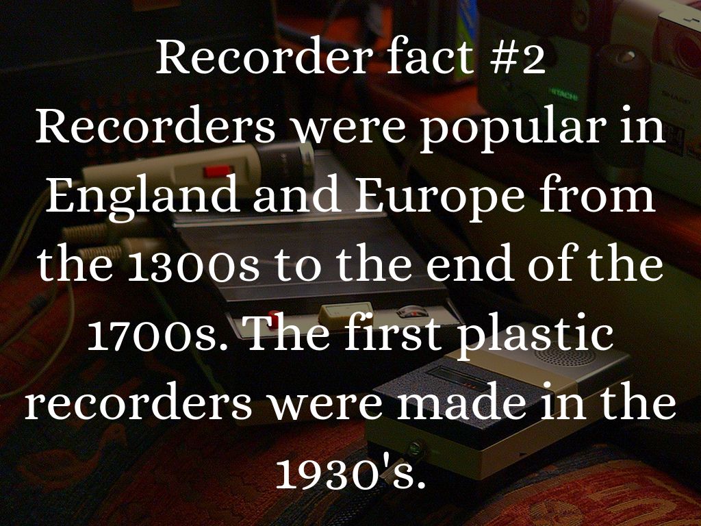 Recorder fact #2 Recorders were popular in England and Europe from the 1300s to the end of the 1700s. The first plastic recorders were made in the 1930's.