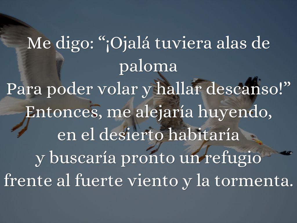 Me digo: “¡Ojalá tuviera alas de paloma Para poder volar y hallar descanso!” Entonces, me alejaría huyendo, en el desierto habitaría y buscaría pronto un refugio frente al fuerte viento y la tormenta.