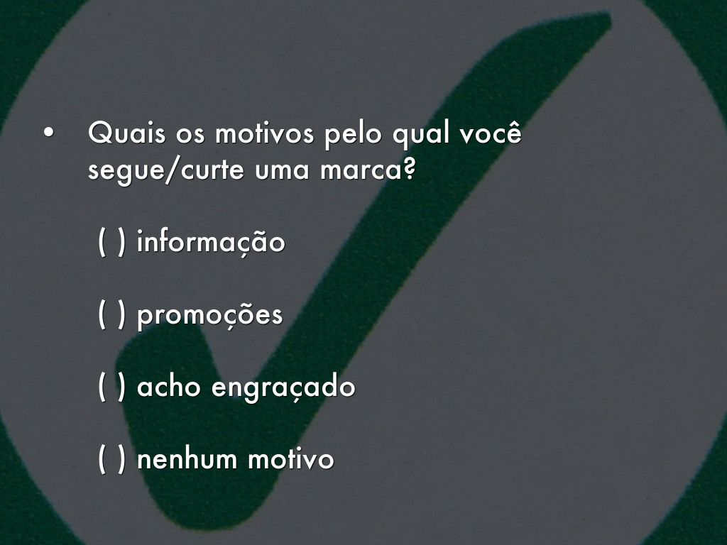 Quais os motivos pelo qual você segue/curte uma marca? ( ) informação ( ) promoções ( ) acho engraçado ( ) nenhum motivo