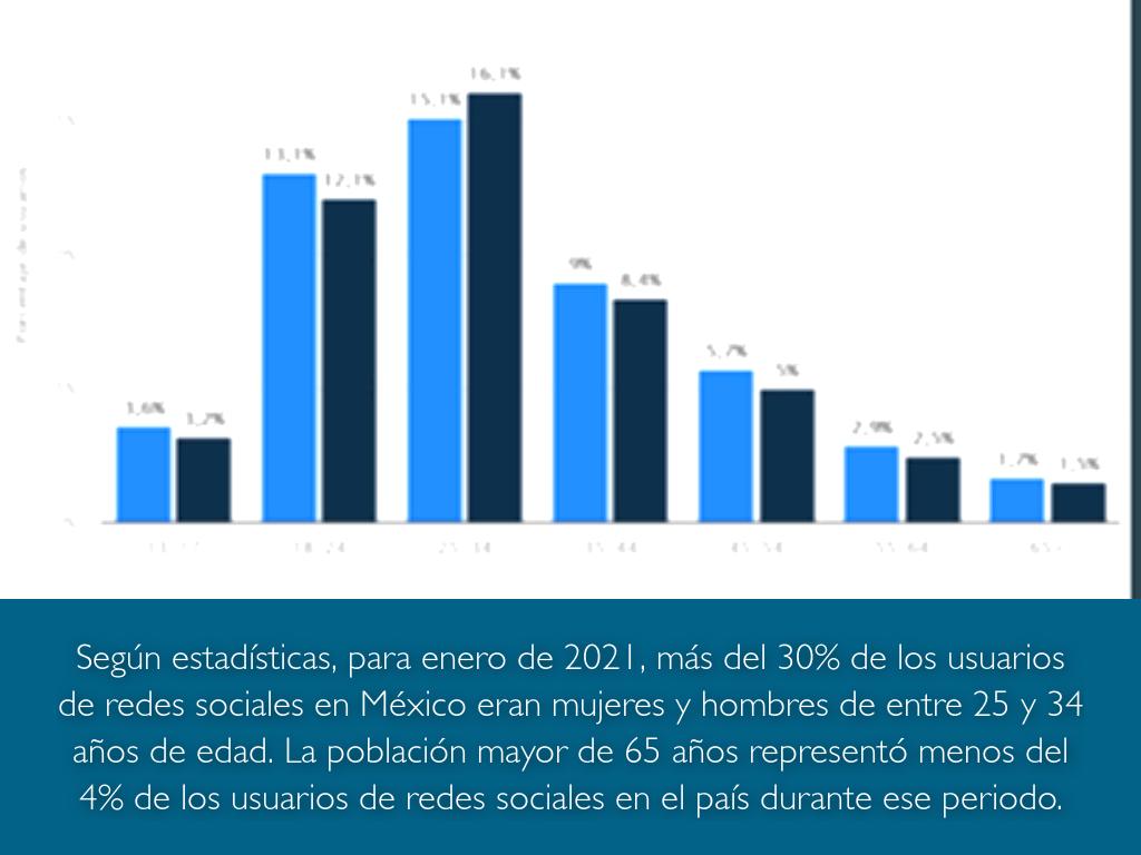 Según estadísticas, para enero de 2021, más del 30% de los usuarios de redes sociales en México eran mujeres y hombres de entre 25 y 34 años de edad. La población mayor de 65 años representó menos del 4% de los usuarios de redes sociales en el país durante ese periodo.