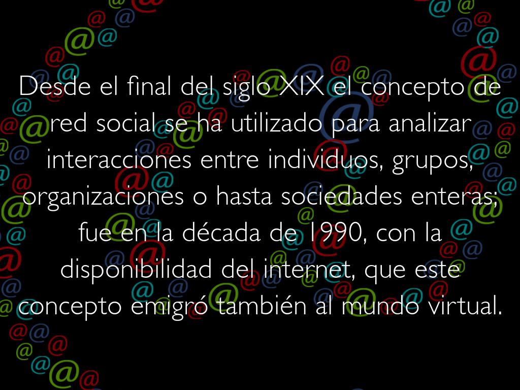 Desde el final del siglo XIX el concepto de red social se ha utilizado para analizar interacciones entre individuos, grupos, organizaciones o hasta sociedades enteras; fue en la década de 1990, con la disponibilidad del internet, que este concepto emigró también al mundo virtual.