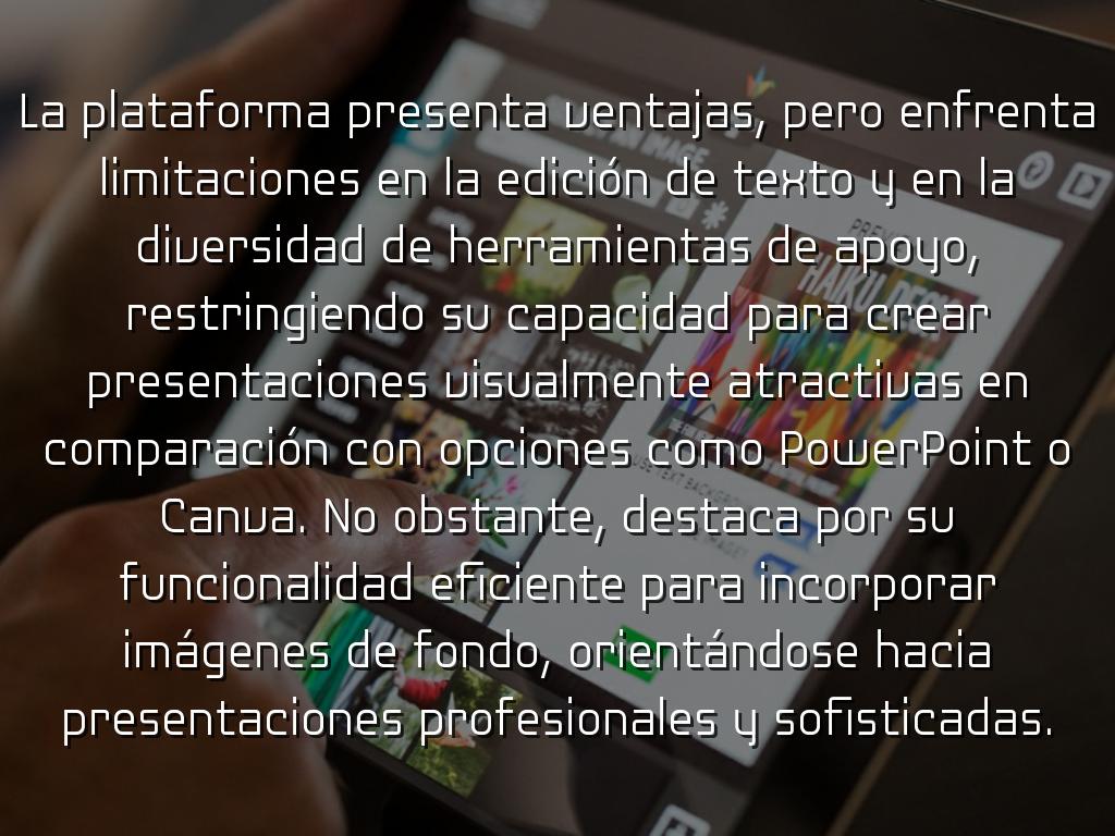 La plataforma presenta ventajas, pero enfrenta limitaciones en la edición de texto y en la diversidad de herramientas de apoyo, restringiendo su capacidad para crear presentaciones visualmente atractivas en comparación con opciones como PowerPoint o Canva. No obstante, destaca por su funcionalidad eficiente para incorporar imágenes de fondo, orientándose hacia presentaciones profesionales y sofisticadas.