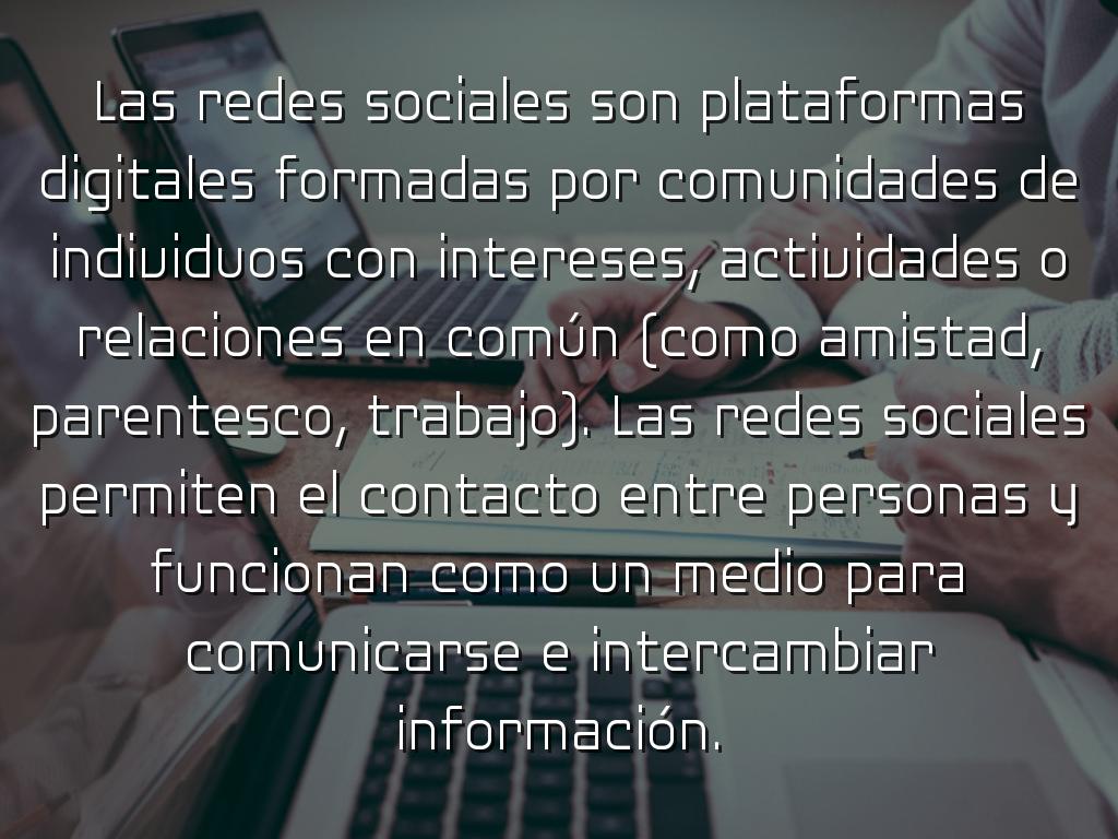 Las redes sociales son plataformas digitales formadas por comunidades de individuos con intereses, actividades o relaciones en común (como amistad, parentesco, trabajo). Las redes sociales permiten el contacto entre personas y funcionan como un medio para comunicarse e intercambiar información.