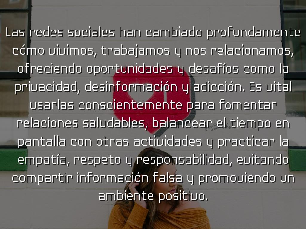 Las redes sociales han cambiado profundamente cómo vivimos, trabajamos y nos relacionamos, ofreciendo oportunidades y desafíos como la privacidad, desinformación y adicción. Es vital usarlas conscientemente para fomentar relaciones saludables, balancear el tiempo en pantalla con otras actividades y practicar la empatía, respeto y responsabilidad, evitando compartir información falsa y promoviendo un ambiente positivo.
