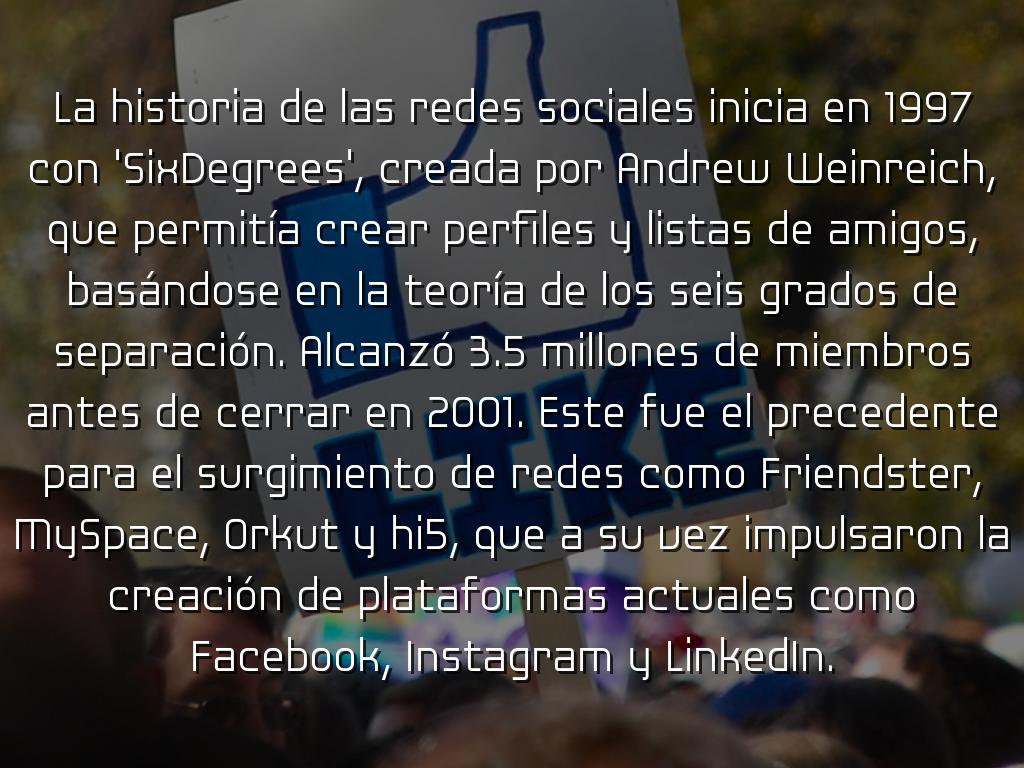 La historia de las redes sociales inicia en 1997 con 'SixDegrees', creada por Andrew Weinreich, que permitía crear perfiles y listas de amigos, basándose en la teoría de los seis grados de separación. Alcanzó 3.5 millones de miembros antes de cerrar en 2001. Este fue el precedente para el surgimiento de redes como Friendster, MySpace, Orkut y hi5, que a su vez impulsaron la creación de plataformas actuales como Facebook, Instagram y LinkedIn.