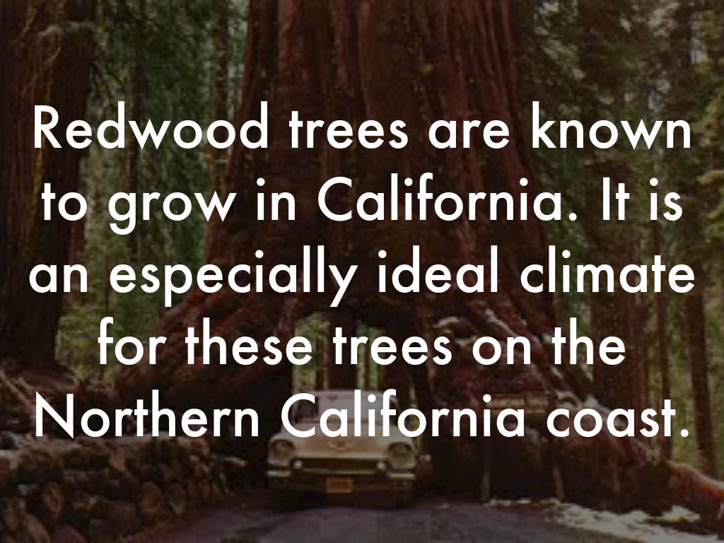 Redwood trees are known to grow in California. It is an especially ideal climate for these trees on the Northern California coast.