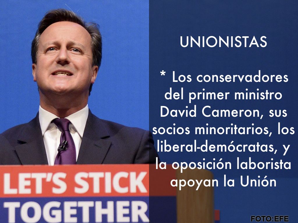 * Los conservadores del primer ministro David Cameron, sus socios minoritarios, los liberal-demócratas, y la oposición laborista apoyan la Unión