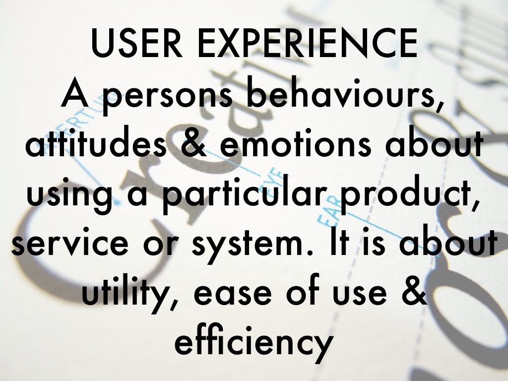 A persons behaviours, attitudes & emotions about using a particular product, service or system. It is about utility, ease of use & efficiency
