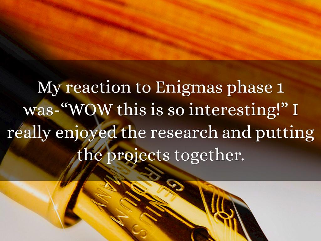 My reaction to Enigmas phase 1 was-“WOW this is so interesting!” I really enjoyed the research and putting the projects together.