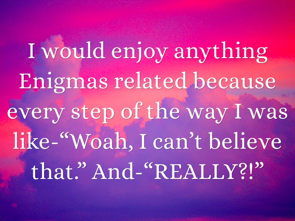 I would enjoy anything Enigmas related because every step of the way I was like-“Woah, I can’t believe that.” And-“REALLY?!”
