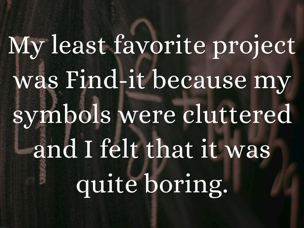 My least favorite project was Find-it because my symbols were cluttered and I felt that it was quite boring.