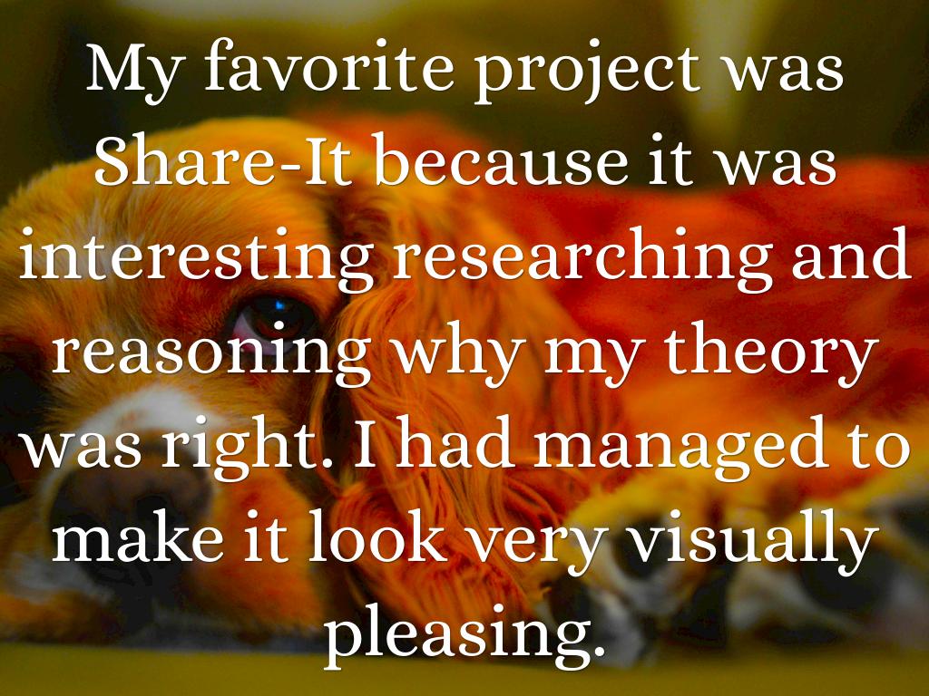 My favorite project was Share-It because it was interesting researching and reasoning why my theory was right. I had managed to make it look very visually pleasing.