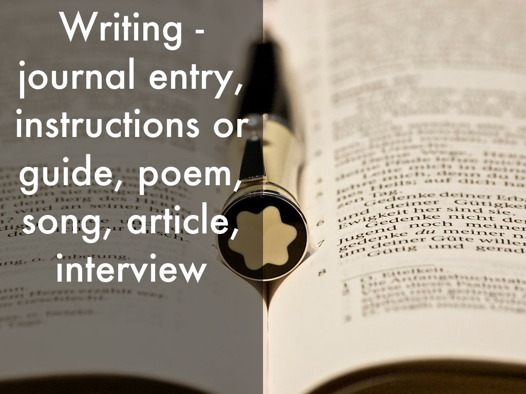 Writing - journal entry, instructions or guide, poem, song, article, interview