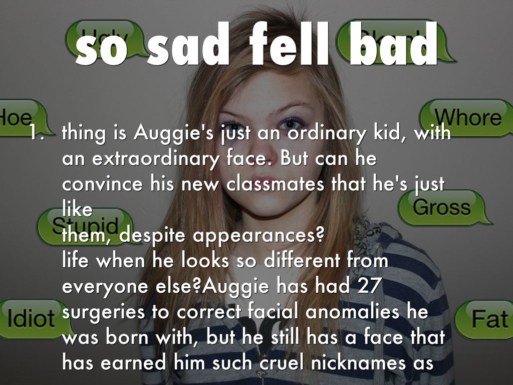 life when he looks so different from everyone else?Auggie has had 27 surgeries to correct facial anomalies he was born with, but he still has a face that has earned him such cruel nicknames as Freak, Freddy Krueger, Gross-out and Lizard face.