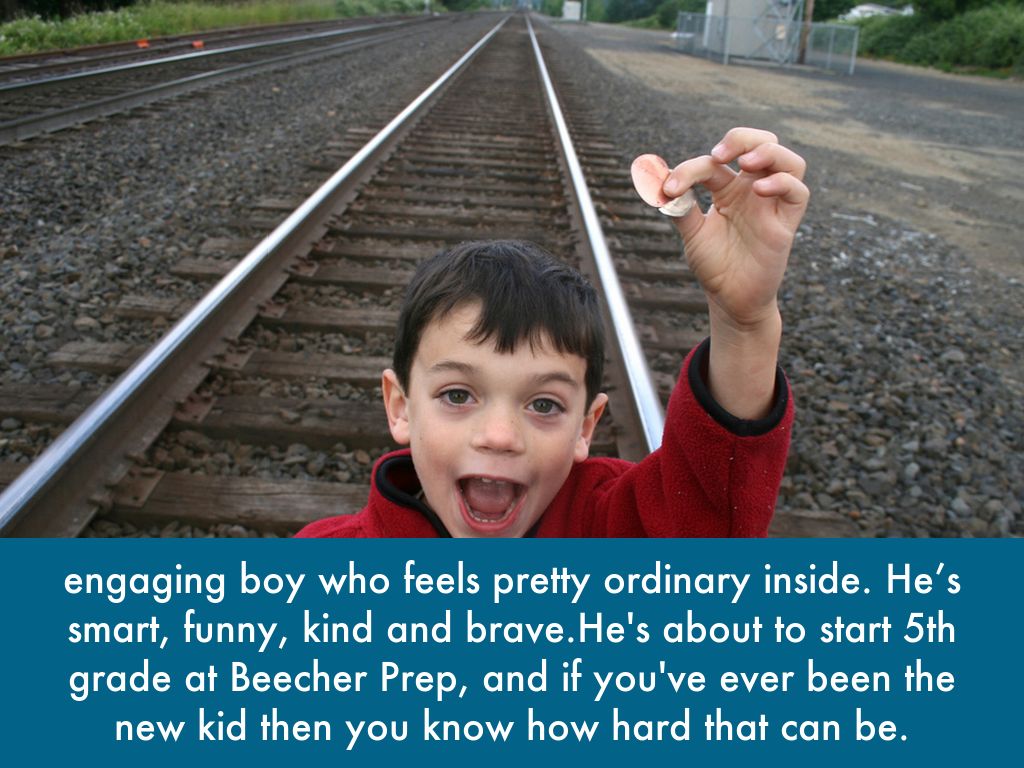 engaging boy who feels pretty ordinary inside. He’s smart, funny, kind and brave.He's about to start 5th grade at Beecher Prep, and if you've ever been the new kid then you know how hard that can be.