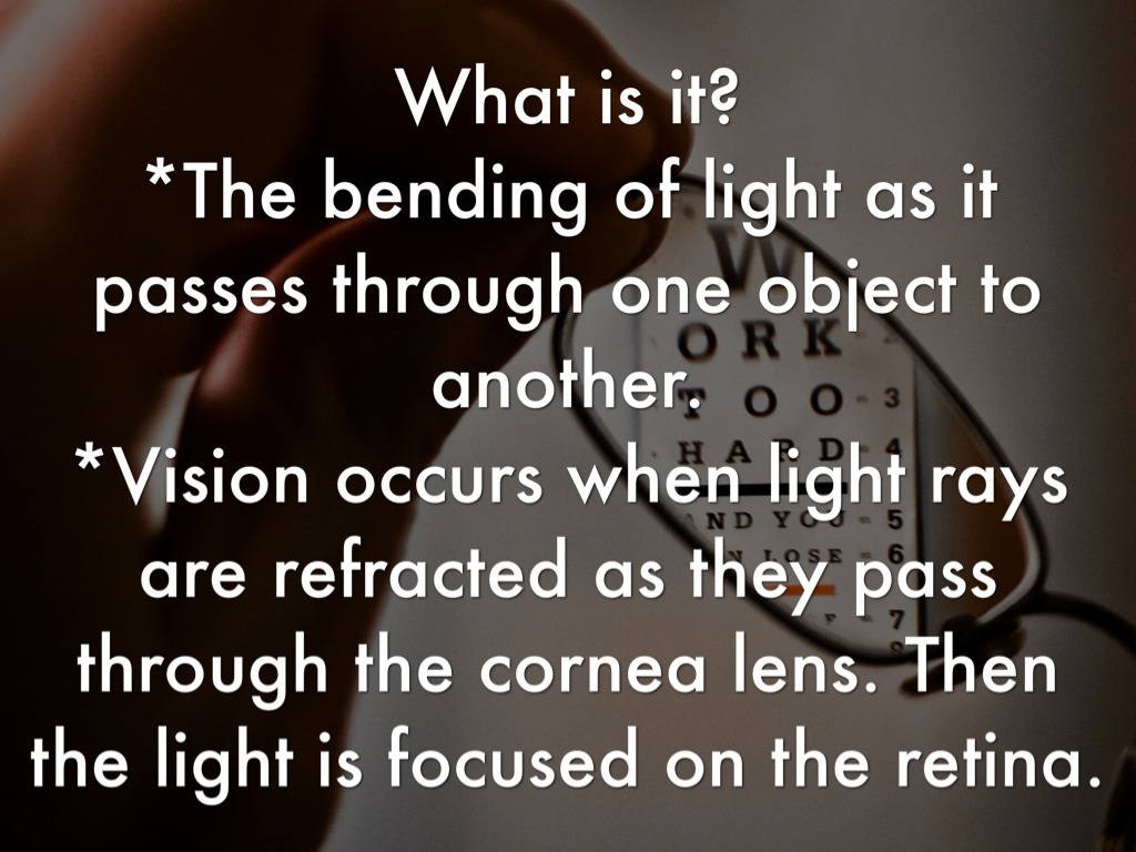 What is it? *The bending of light as it passes through one object to another. *Vision occurs when light rays are refracted as they pass through the cornea lens. Then the light is focused on the retina.