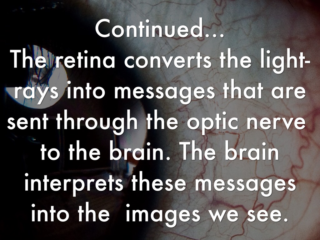 Continued... The retina converts the light-rays into messages that are sent through the optic nerve to the brain. The brain interprets these messages into the images we see.