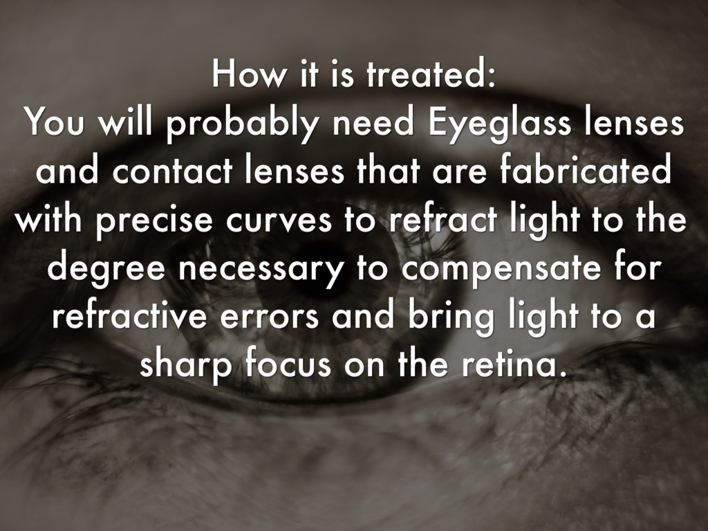 How it is treated: You will probably need Eyeglass lenses and contact lenses that are fabricated with precise curves to refract light to the degree necessary to compensate for refractive errors and bring light to a sharp focus on the retina.