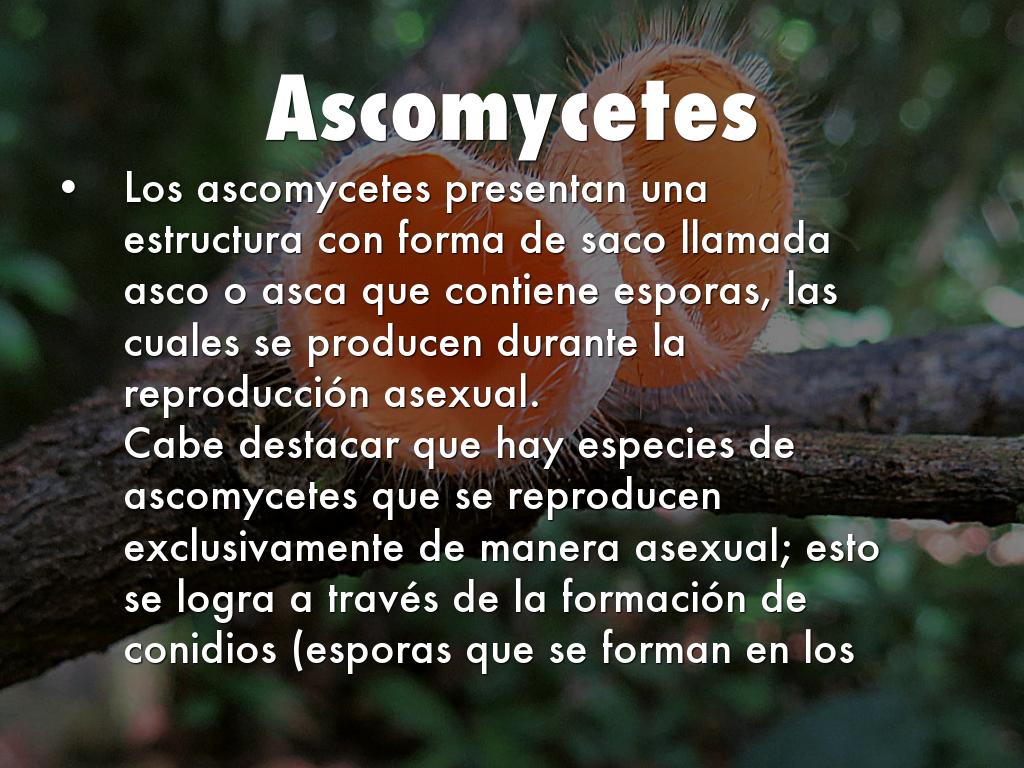 Los ascomycetes presentan una estructura con forma de saco llamada asco o asca que contiene esporas, las cuales se producen durante la reproducción asexual.