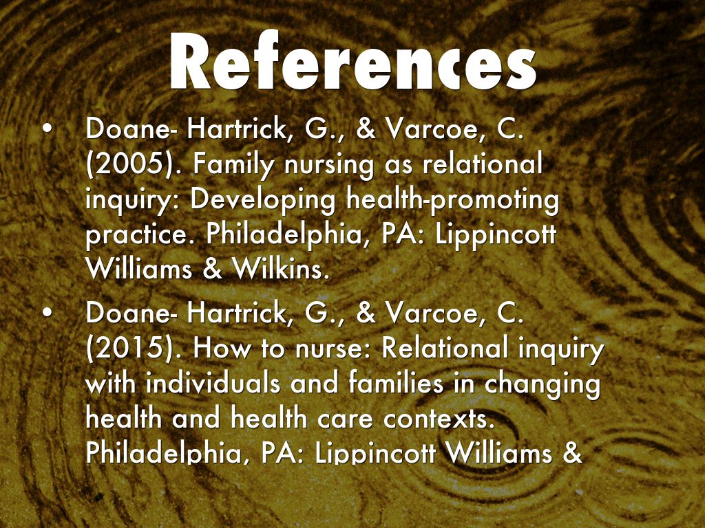Doane- Hartrick, G., & Varcoe, C. (2005). Family nursing as relational inquiry: Developing health-promoting practice. Philadelphia, PA: Lippincott Williams & Wilkins.