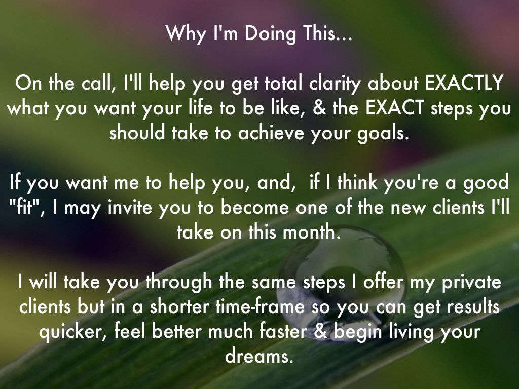On the call, I'll help you get total clarity about EXACTLY what you want your life to be like, & the EXACT steps you should take to achieve your goals.