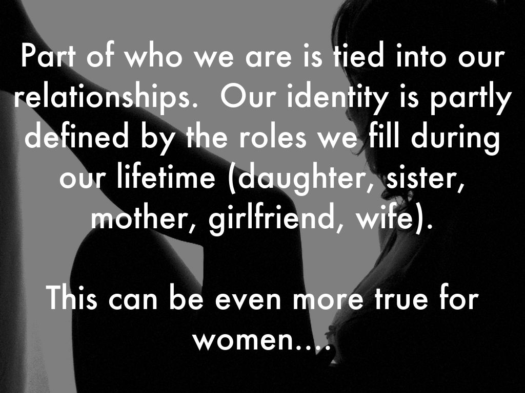 Part of who we are is tied into our relationships. Our identity is partly defined by the roles we fill during our lifetime (daughter, sister, mother, girlfriend, wife).