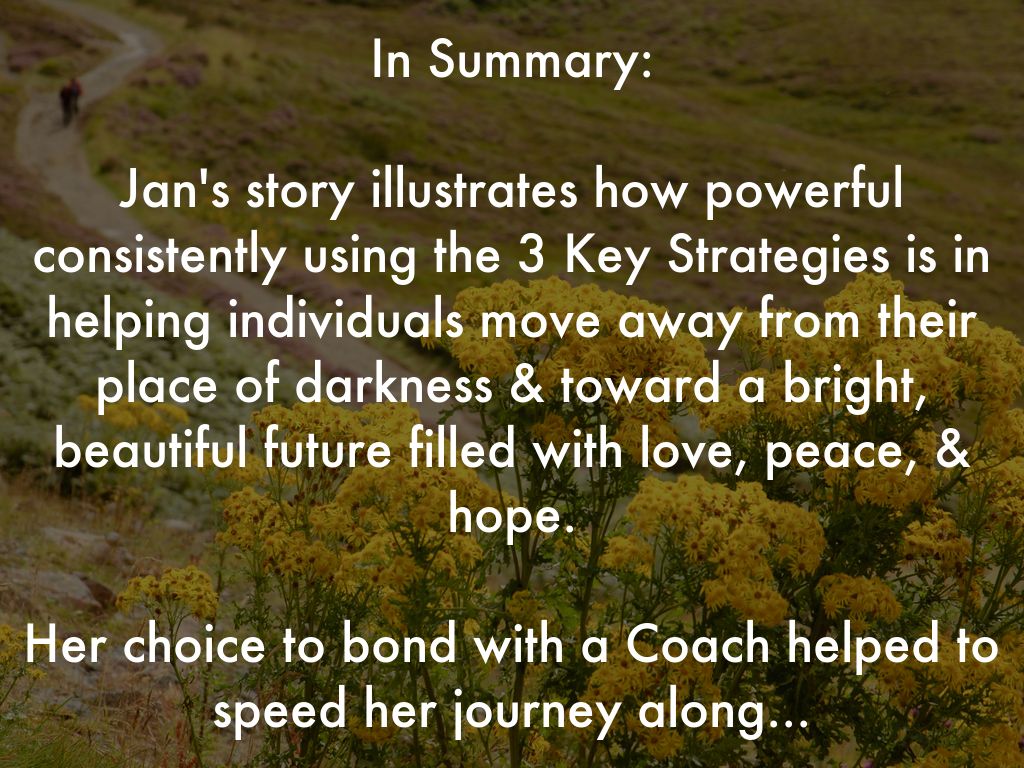 Jan's story illustrates how powerful consistently using the 3 Key Strategies is in helping individuals move away from their place of darkness & toward a bright, beautiful future filled with love, peace, & hope.