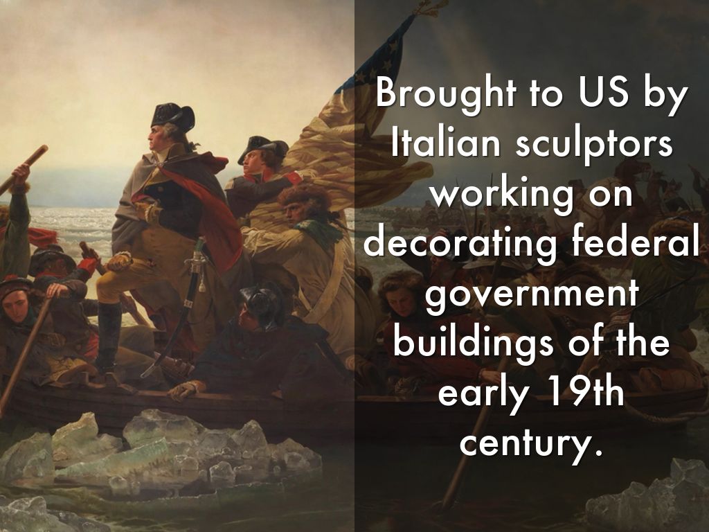 Brought to US by Italian sculptors working on decorating federal government buildings of the early 19th century.
