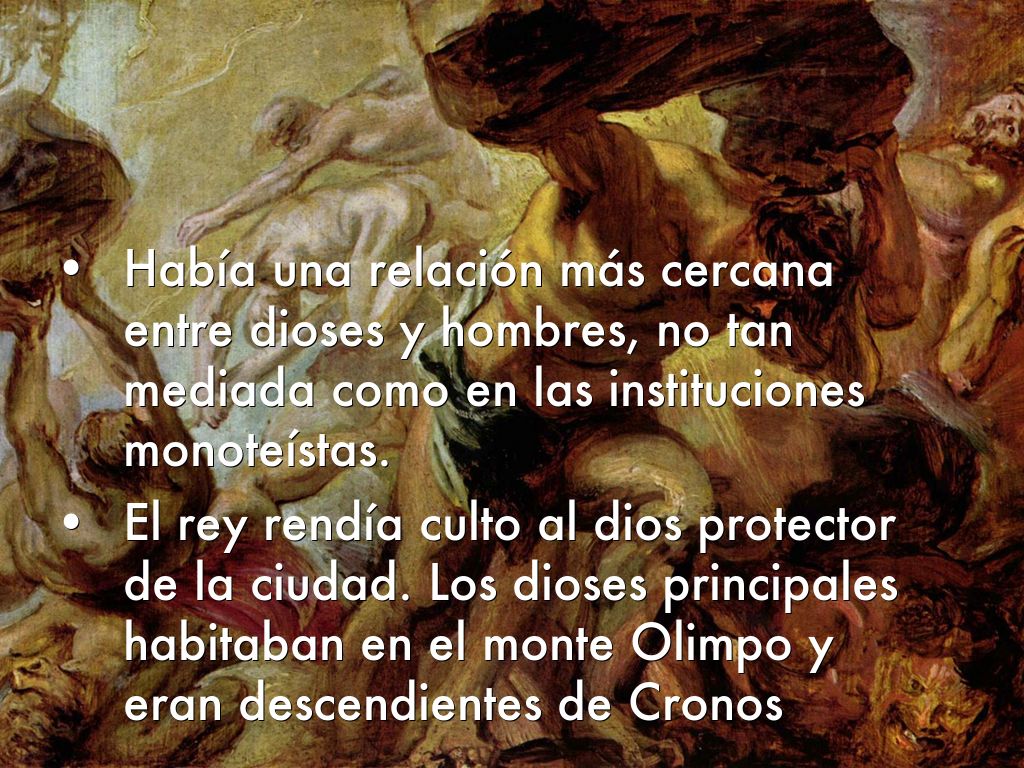 - Había una relación más cercana entre dioses y hombres, no tan mediada como en las instituciones monoteístas.