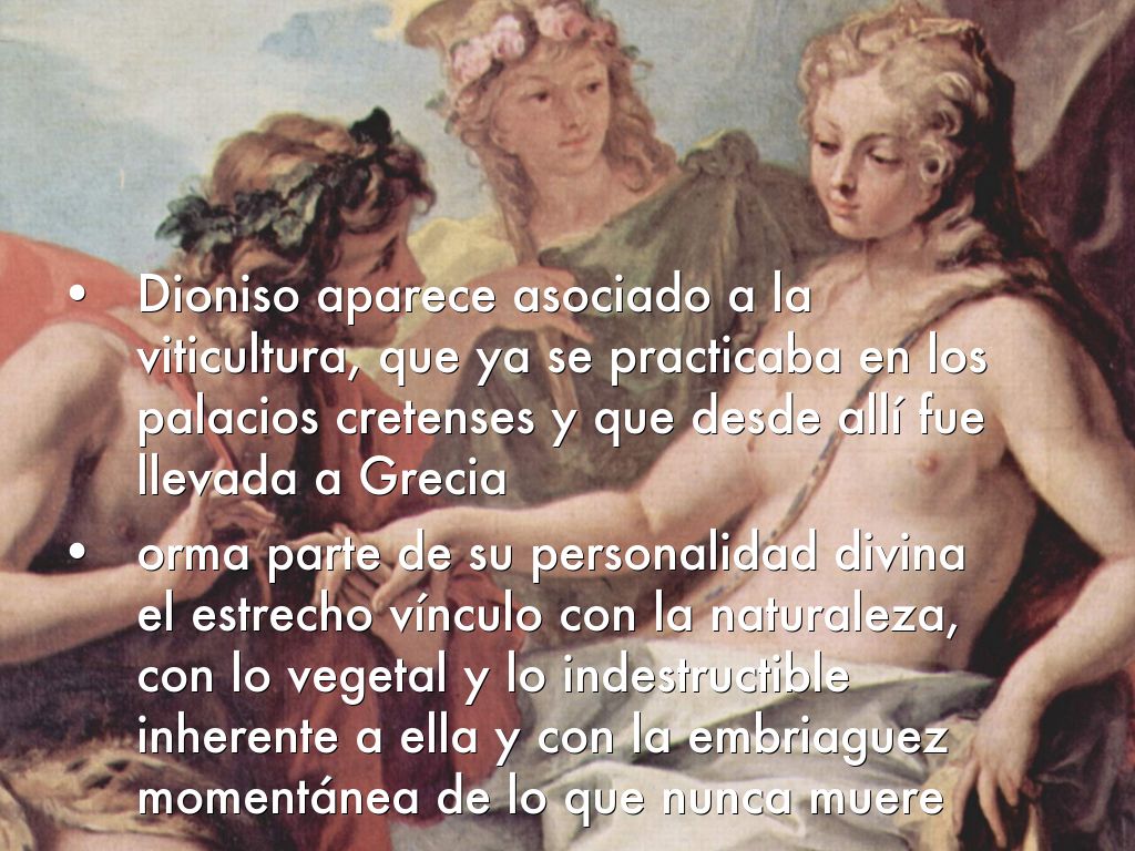 - Dioniso aparece asociado a la viticultura, que ya se practicaba en los palacios cretenses y que desde allí fue llevada a Grecia