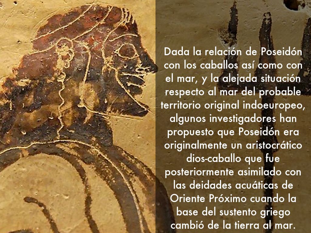 Dada la relación de Poseidón con los caballos así como con el mar, y la alejada situación respecto al mar del probable territorio original indoeuropeo, algunos investigadores han propuesto que Poseidón era originalmente un aristocrático dios-caballo que fue posteriormente asimilado con las deidades acuáticas de Oriente Próximo cuando la base del sustento griego cambió de la tierra al mar.