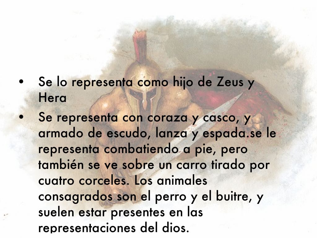 - Se representa con coraza y casco, y armado de escudo, lanza y espada.se le representa combatiendo a pie, pero también se ve sobre un carro tirado por cuatro corceles. Los animales consagrados son el perro y el buitre, y suelen estar presentes en las representaciones del dios.