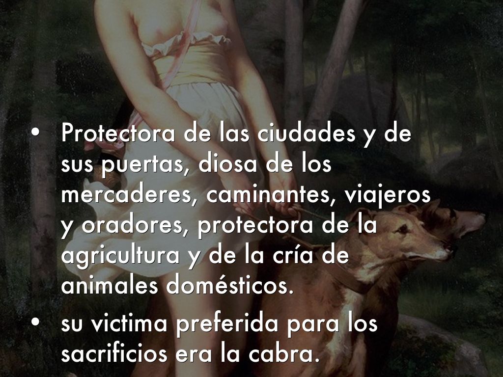 - Protectora de las ciudades y de sus puertas, diosa de los mercaderes, caminantes, viajeros y oradores, protectora de la agricultura y de la cría de animales domésticos.