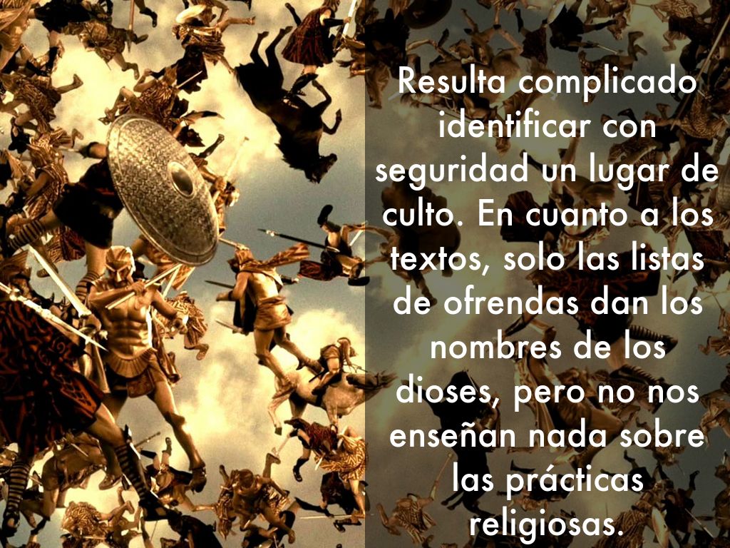 Resulta complicado identificar con seguridad un lugar de culto. En cuanto a los textos, solo las listas de ofrendas dan los nombres de los dioses, pero no nos enseñan nada sobre las prácticas religiosas.