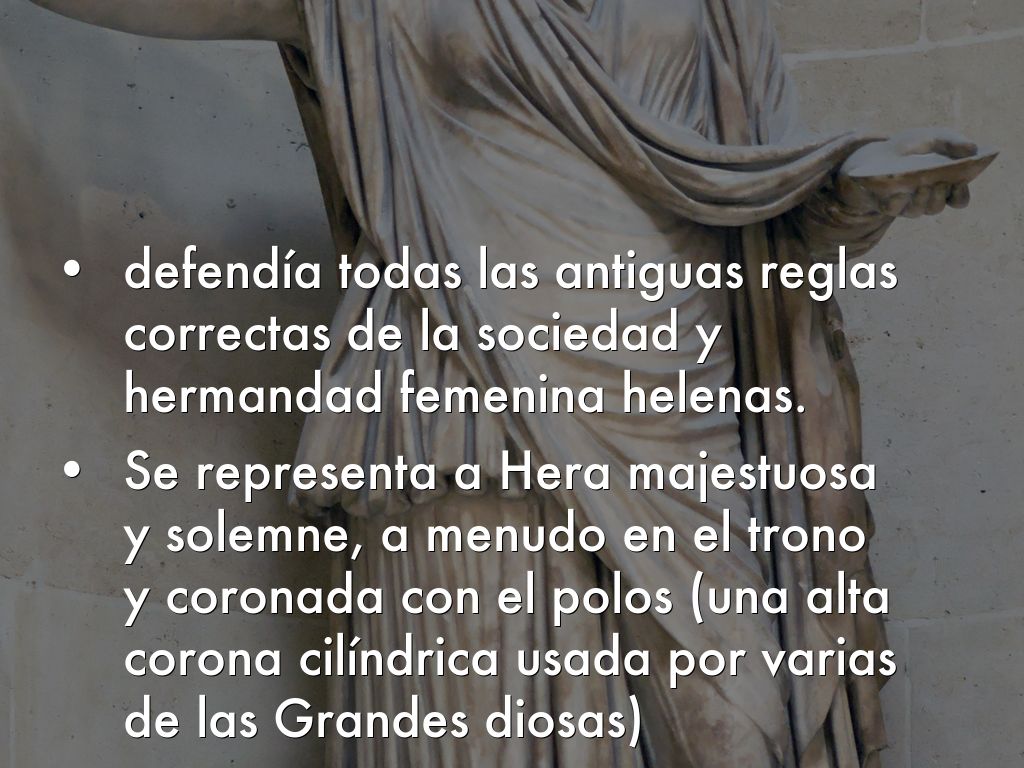 - Se representa a Hera majestuosa y solemne, a menudo en el trono y coronada con el polos (una alta corona cilíndrica usada por varias de las Grandes diosas)