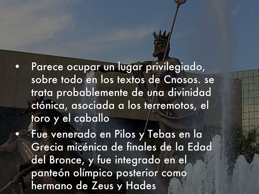 - Fue venerado en Pilos y Tebas en la Grecia micénica de finales de la Edad del Bronce, y fue integrado en el panteón olímpico posterior como hermano de Zeus y Hades