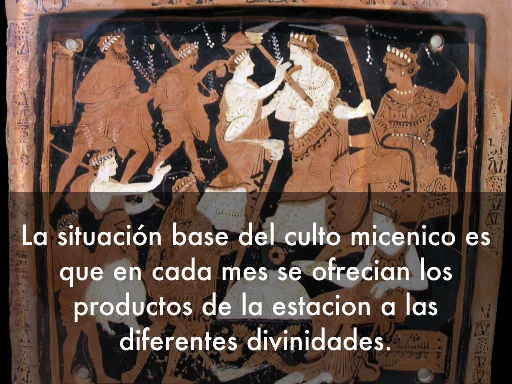 La situación base del culto micenico es que en cada mes se ofrecian los productos de la estacion a las diferentes divinidades.