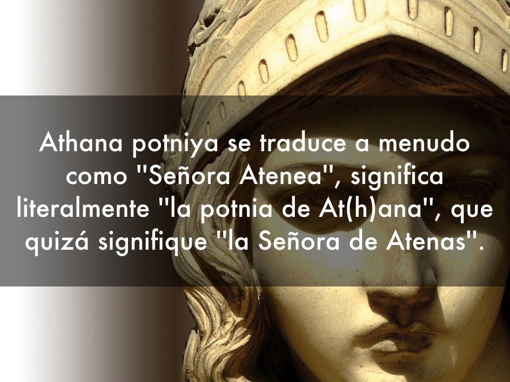 Athana potniya se traduce a menudo como ''Señora Atenea'', significa literalmente ''la potnia de At(h)ana'', que quizá signifique ''la Señora de Atenas''.