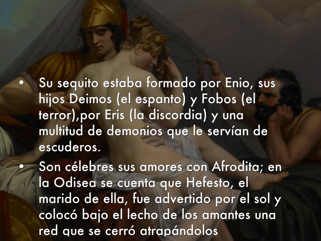 - Su sequito estaba formado por Enio, sus hijos Deimos (el espanto) y Fobos (el terror),por Eris (la discordia) y una multitud de demonios que le servían de escuderos.