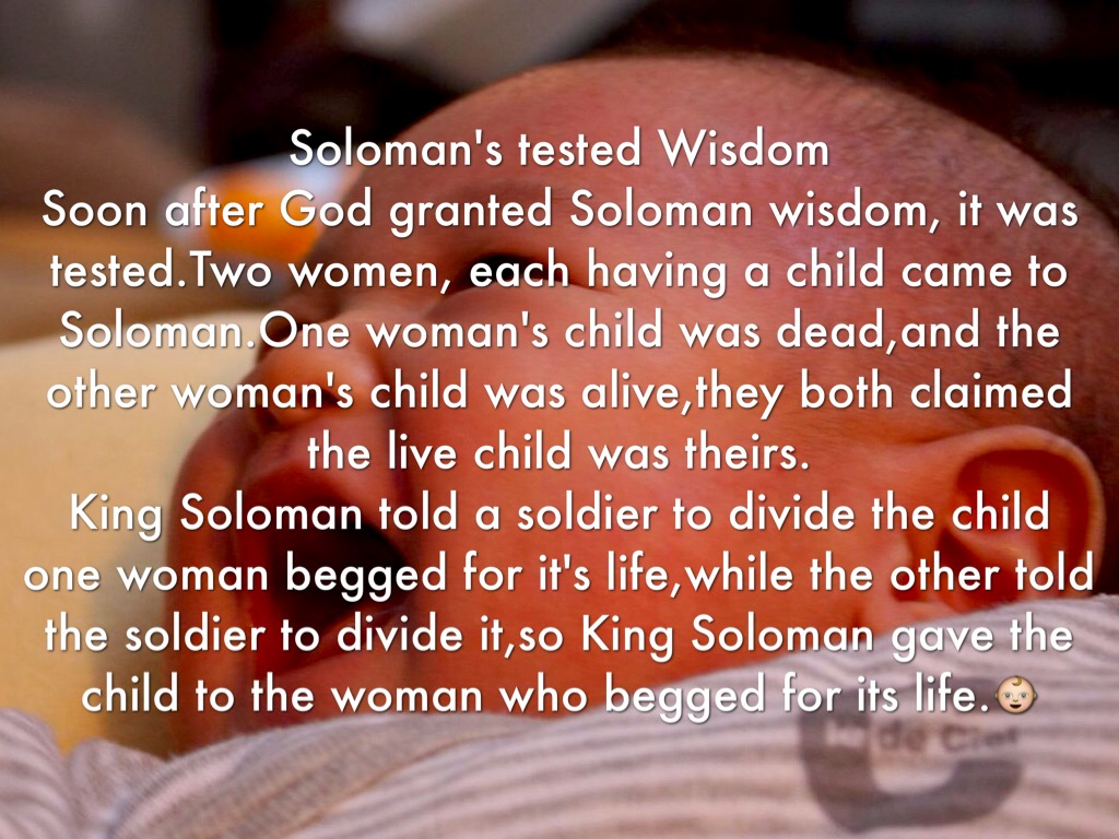 Soloman's tested Wisdom Soon after God granted Soloman wisdom, it was tested.Two women, each having a child came to Soloman.One woman's child was dead,and the other woman's child was alive,they both claimed the live child was theirs. King Soloman told a soldier to divide the child one woman begged for it's life,while the other told the soldier to divide it,so King Soloman gave the child to the woman who begged for its life.👶