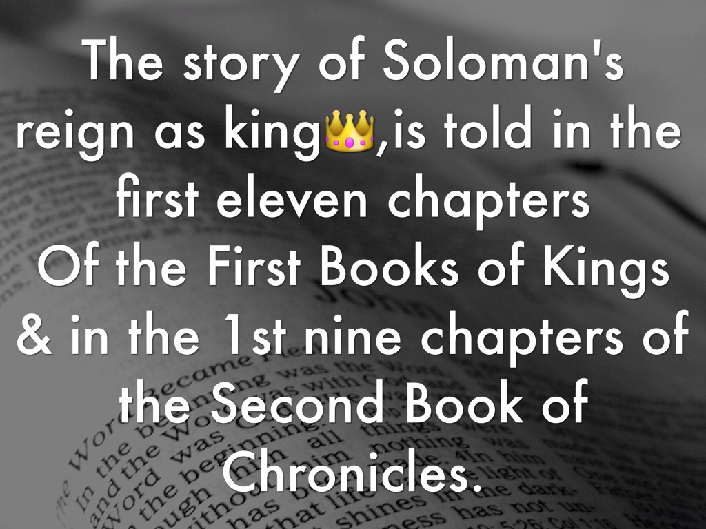 The story of Soloman's reign as king👑,is told in the first eleven chapters Of the First Books of Kings & in the 1st nine chapters of the Second Book of Chronicles.