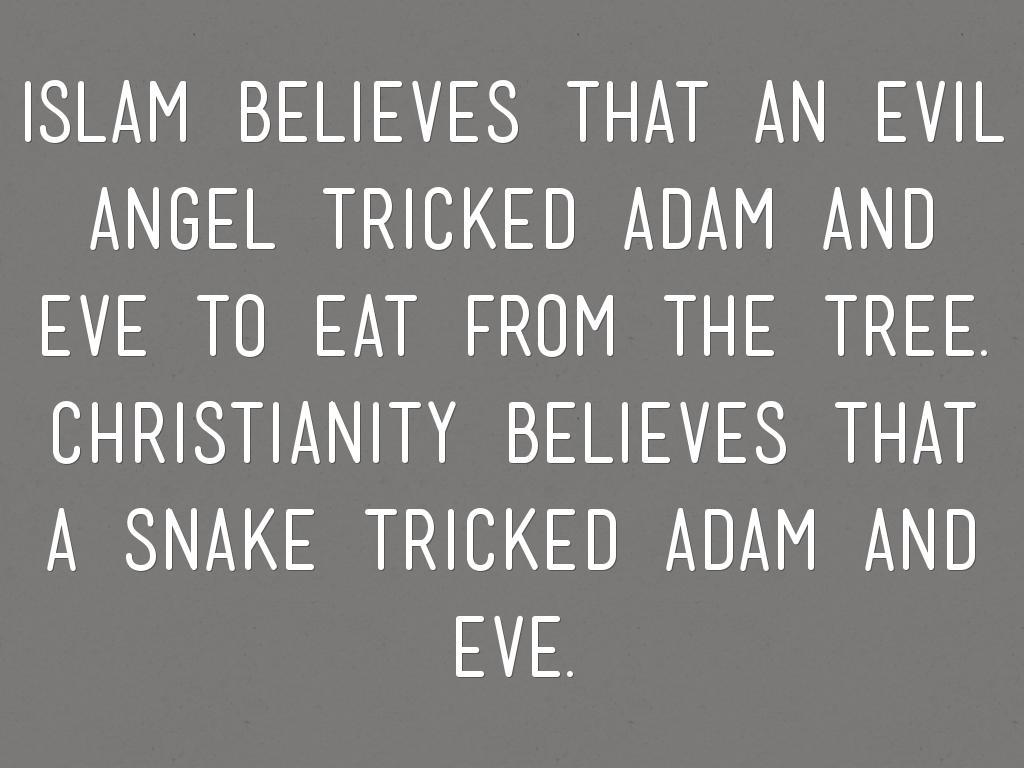 Islam believes that an evil angel tricked adam and eve to eat from the tree. Christianity believes that a snake tricked adam and eve.